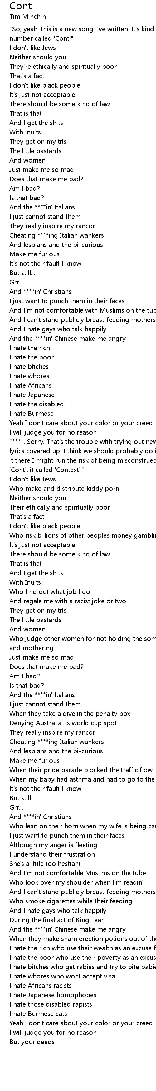 "****, Sorry. That's the trouble with trying out new stuff. I had half the lyrics covered up. I think we should probably do it again. I think if we leave it there I might run the risk of being misconstrued. It's not even called 'Cont', it called 'Context'."
