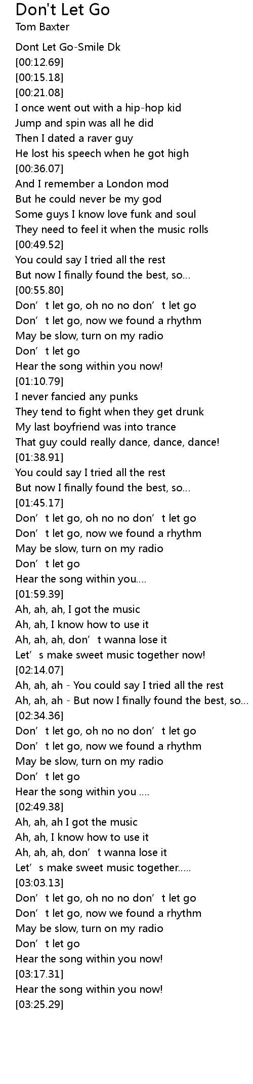 | [00:02.23] | Dont Let Go-Smile Dk |