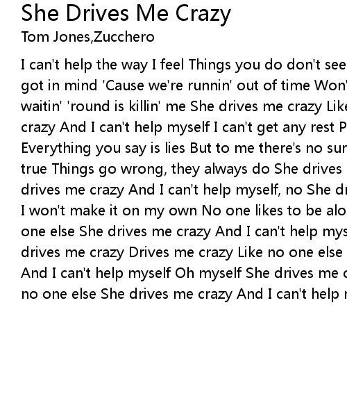 | I can't help the way I feel Things you do don't seem so real Tell me what you got in mind 'Cause we're runnin' out of time Won't you ever set me free This waitin' 'round is killin' me She drives me crazy Like no one else She drives me crazy And I can't help myself I can't get any rest People say I'm obsessed Everything you say is lies But to me there's no surprise What I have, I knew was true Things go wrong, they always do She drives me crazy Like no one else She drives me crazy And I can't help myself, no She drives me crazy Like no one else I won't make it on my own No one likes to be alone She drives me crazy Like no one else She drives me crazy And I can't help myself I can't help myself She drives me crazy Drives me crazy Like no one else You know she drives me crazy And I can't help myself Oh myself She drives me crazy, oh yes Like no one else, no one else She drives me crazy And I can't help myself |