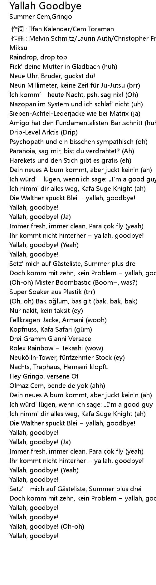 | [01:56.87] | Doch komm mit zehn, kein Problem − yallah, goodbye! |