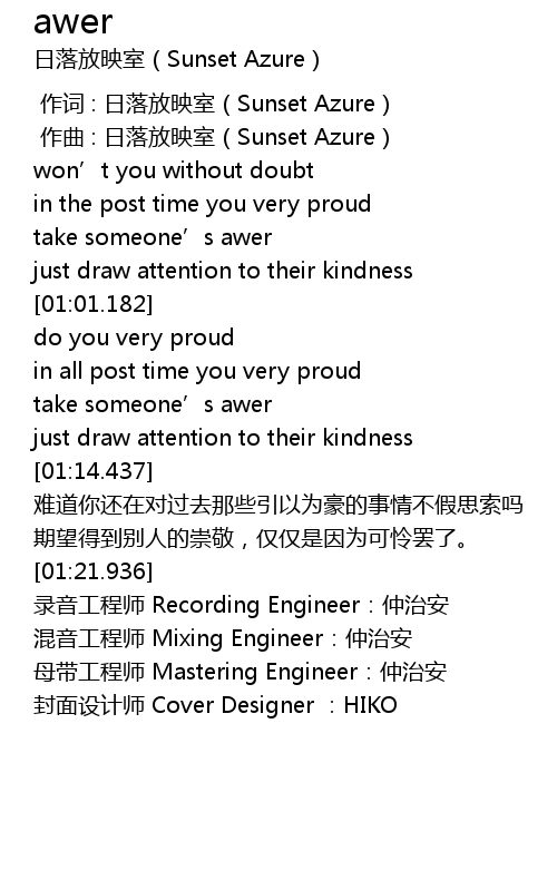 | [00:01.000] | 作曲 : 日落放映室(Sunset Azure) |