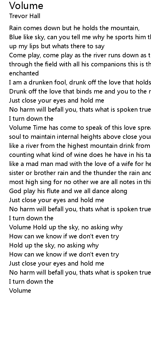 Volume Time has come to speak of this love spread your wings of your song and soul to maintain internal heights above close your eyes and feel it unfold rush like a river from the highest mountain drink from the fountain and stop your counting what kind of wine does he have in his tavern oh so enchanted and sing like a mad man mad with the love of a wife for her husband child or mother, sister or brother rain and the thunder the rain and the thunder sing for the most high sing for no other we are all notes in this eternal song |