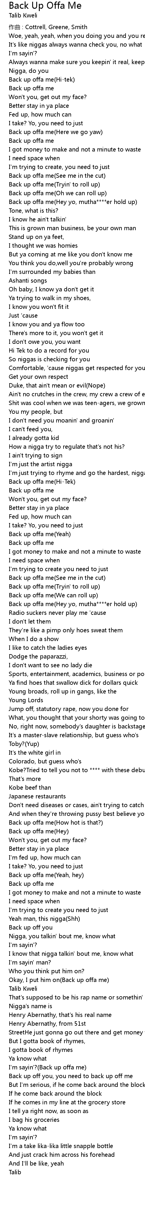 | Back up offa me(Hey yo, mutha****er hold up) | |