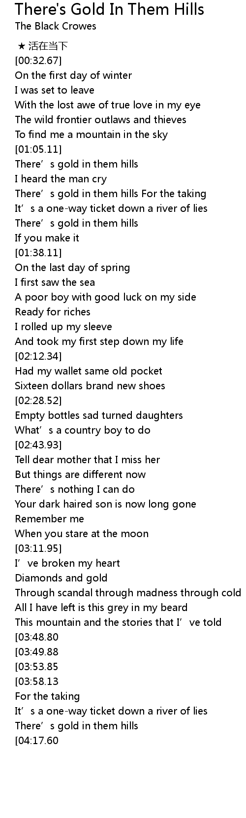 | [04:29.80][03:58.13] | There' s gold in them hills |