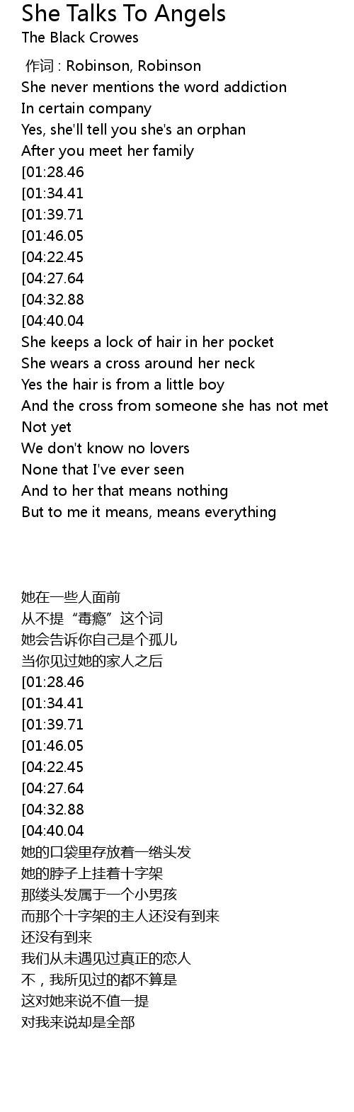 | [04:47.69][04:22.45][02:46.39][01:52.75] | 她说她会和天使交谈 |