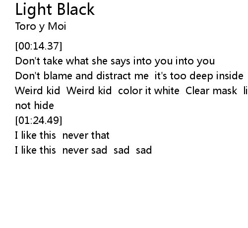 | [00:53.95] | Weird kid Weird kid color it white Clear mask light black-it will not hide |
