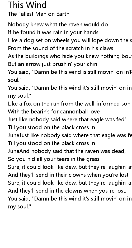 You said, "Damn be this wind it's still movin' on inTo the bones and the bed of my soul." |
