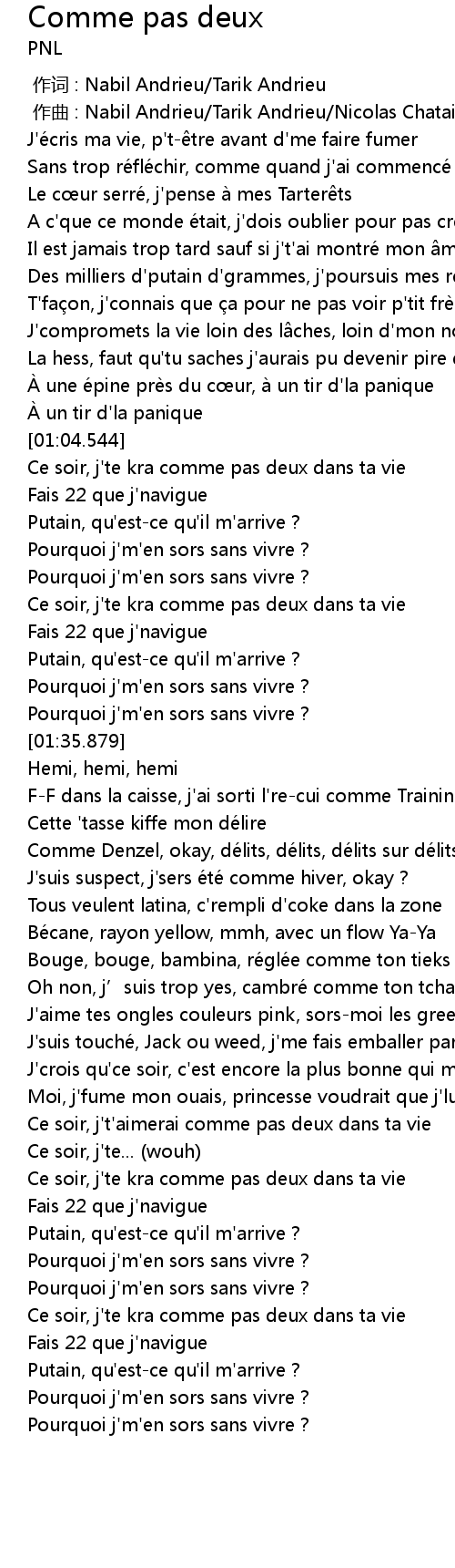 | [02:58.989] | Pourquoi j'm'en sors sans vivre ? |