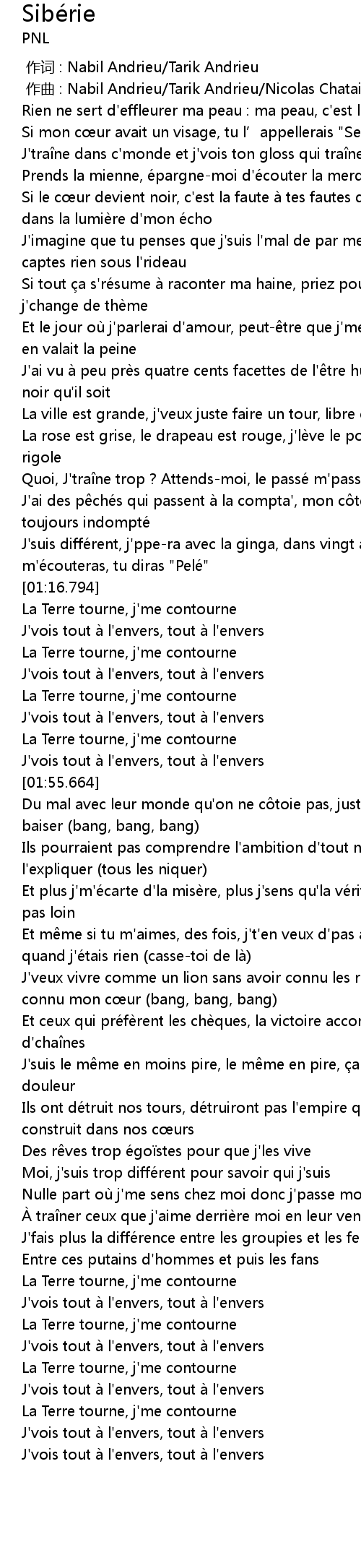 | [02:47.313] | Nulle part ou j' me sens chez moi donc j' passe mon temps a fuir |
