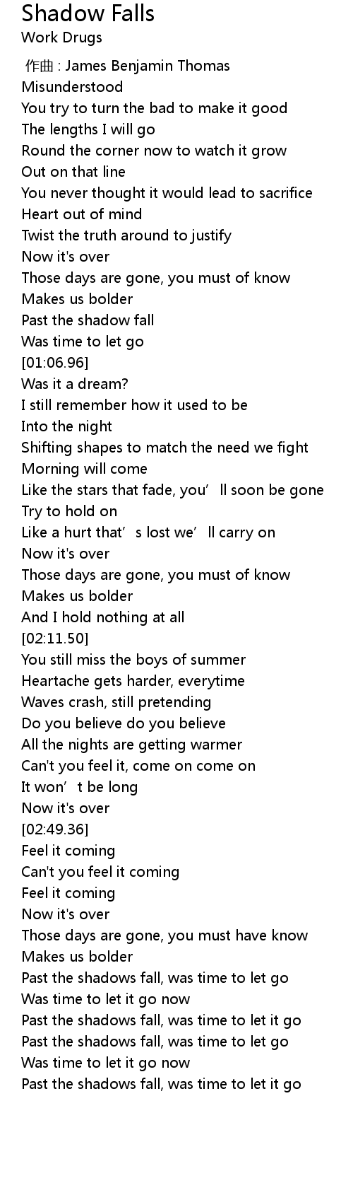 | [03:17.13] | Past the shadows fall, was time to let go |