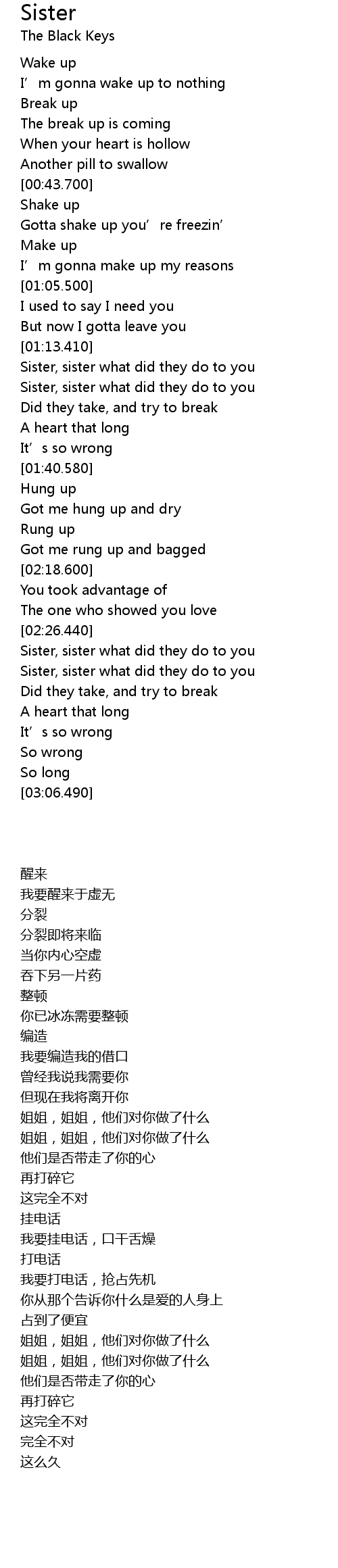| [02:35.400] | Sister, sister what did they do to you |