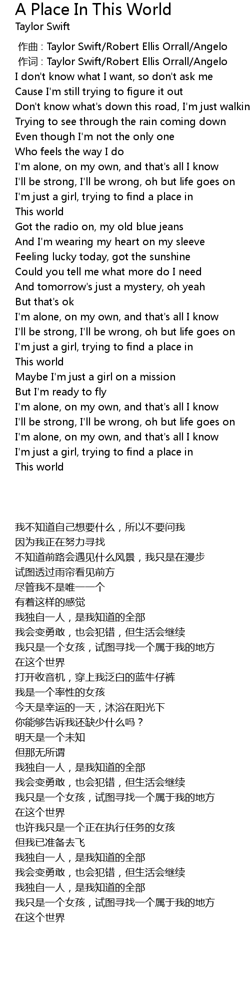 | [01:37.950] | 我只是一个女孩,试图寻找一个属于我的地方 |
