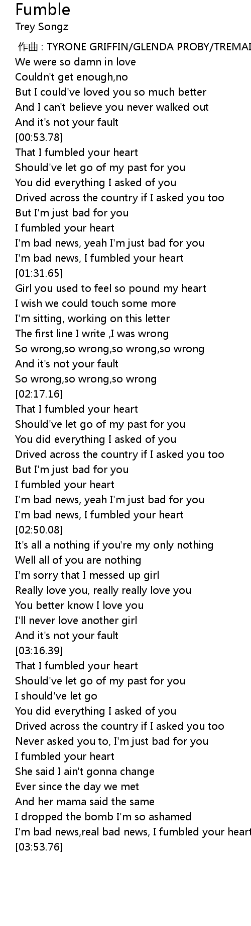 | [03:46.81] | I' m bad news, real bad news, I fumbled your heart |