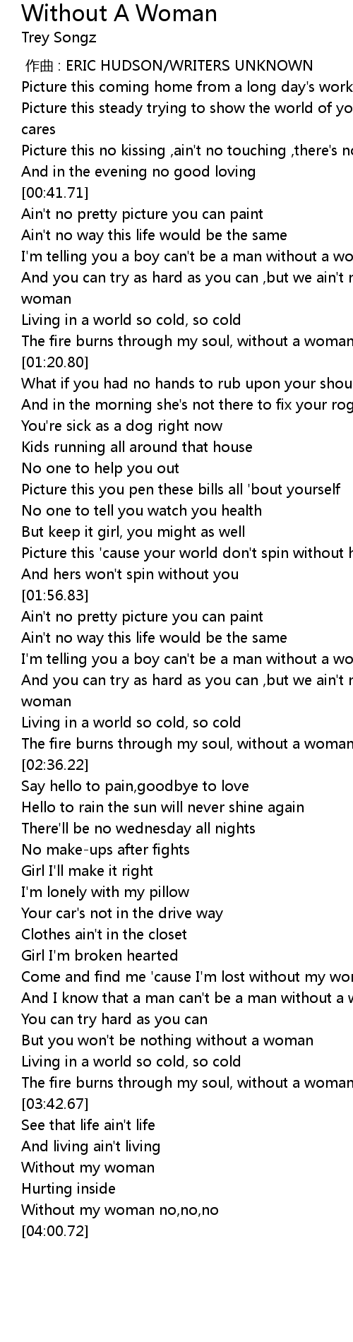 | [03:09.82] | Come and find me 'cause I'm lost without my woman |