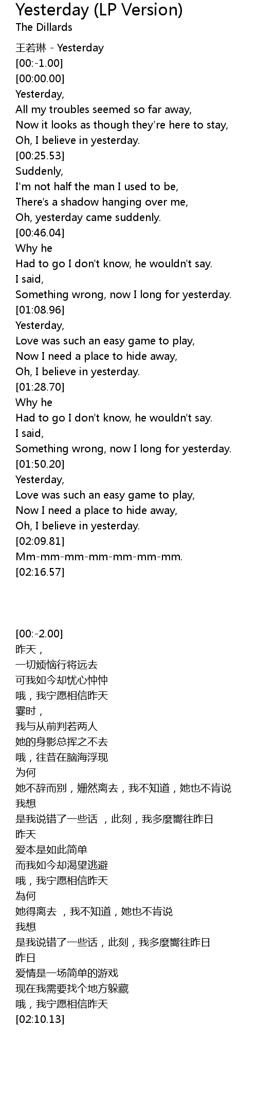 | [00:40.16] | Oh, yesterday came suddenly. |