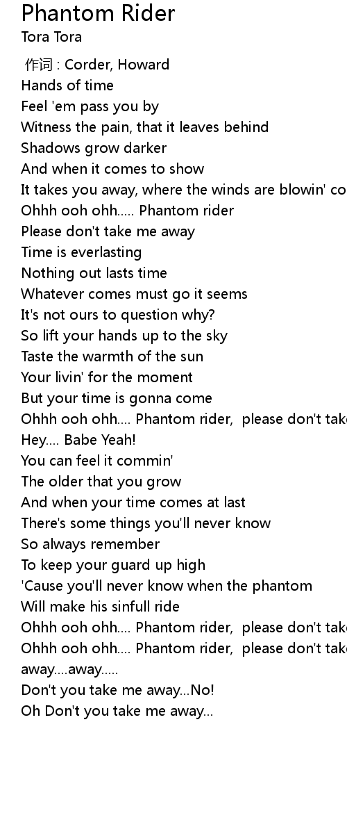 | [01:32.05] | Ohhh ooh ohh.... Phantom rider, please don' t take me away.... |