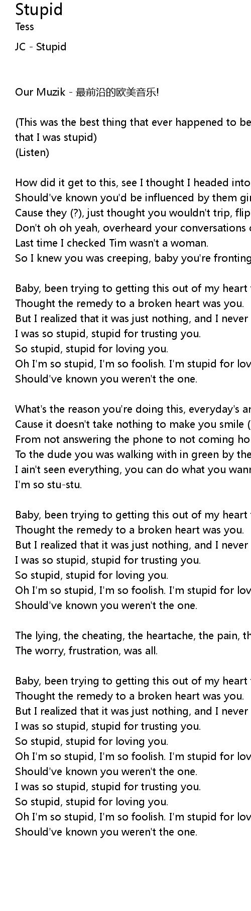 | So I knew you was creeping, baby you' re fronting. I feel so stupid. | |