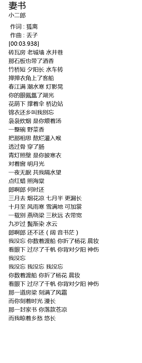 | [02:51.804] | 郎啊郎 何时还 |