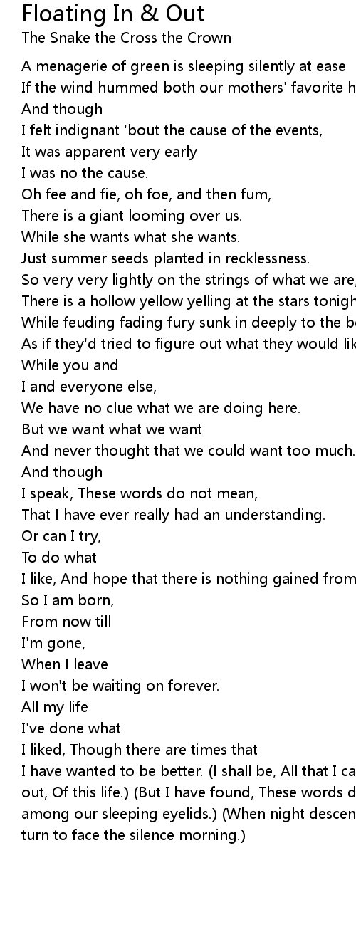 I have wanted to be better. (I shall be, All that I can see, Floating in and out, Of this life.) (But I have found, These words do not resound, But float among our sleeping eyelids.) (When night descends, And lays me in my bed, I'll turn to face the silence morning.) |