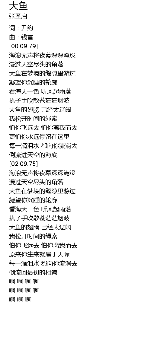 | [03:00.26] | 大鱼的翅膀 已经太辽阔 |