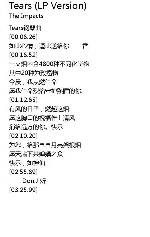 | [00:33.84] | 一支烟内含4800种不同化学物 |