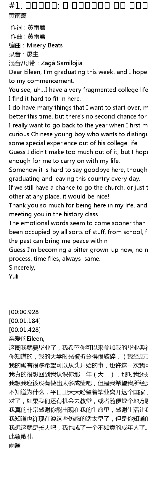 | [00:01.694] | Dear Eileen, I' m graduating this week, and I hope that you can come to my commencement. |