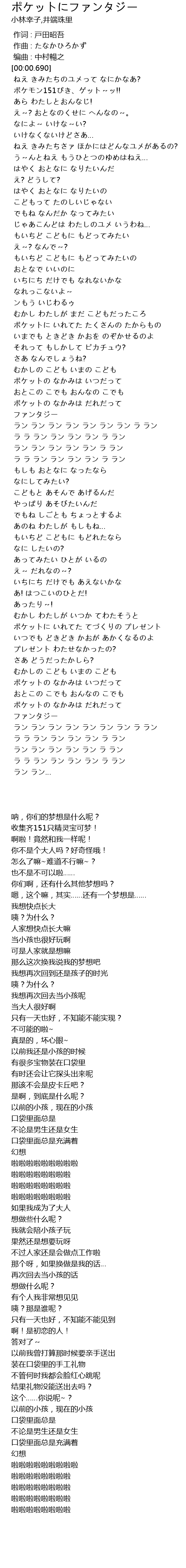 | [01:31.089] | ポケットの なかみは だれだって |