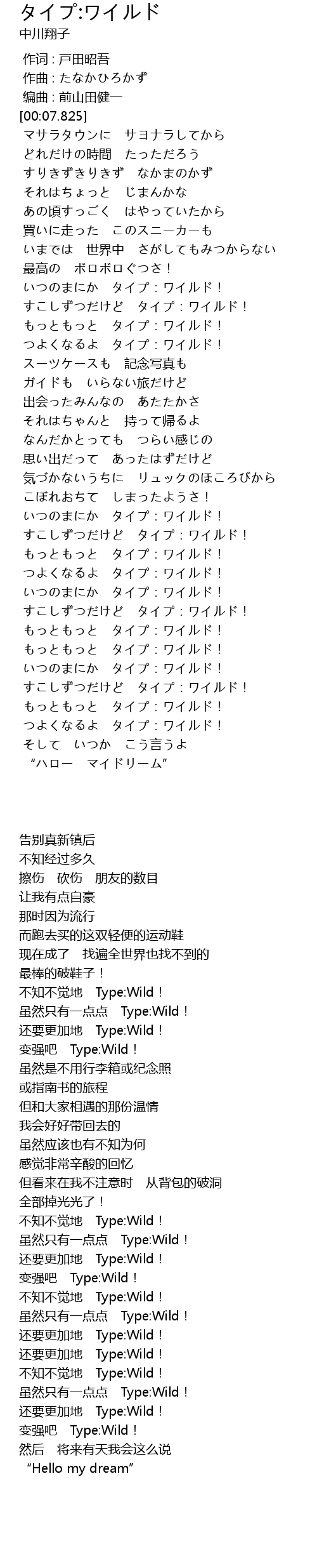 | [02:56.662] | 还要更加地 Type:Wild! |
