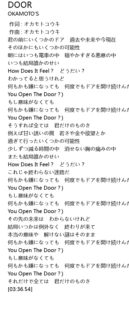 | [00:56.48] | 何もかも嫌になっても 何度でもドアを開け続けんだ(Can You Open The Door?) |