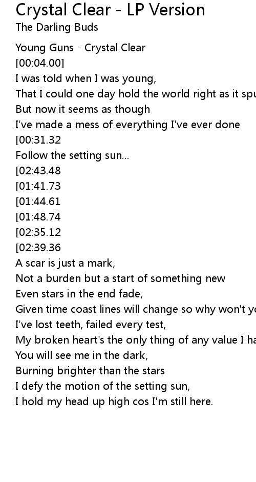 [02:49.03][02:43.48][02:22.00][01:38.62][00:43.36] It's crystal clear to me