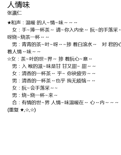 | 男:青青的茶~叶~呀~~掺 着白滚水~ 对 君的心~意~ 带 着人情~味~~ | |