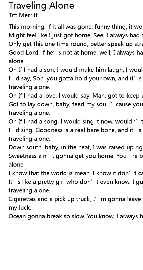 | Got to lay down, baby, feed my soul, ’cause you know I got a taste for traveling alone. | |
