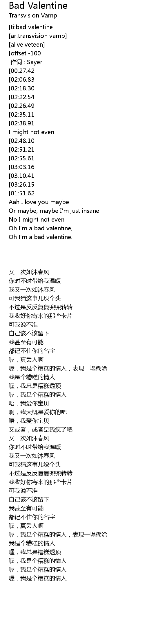 | [01:18.68][03:03.16] | I' m a bad valentine |
