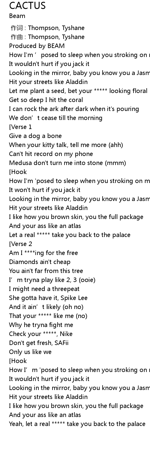| [00:53.120] | How I'm 'posed to sleep when you stroking on my cactus |