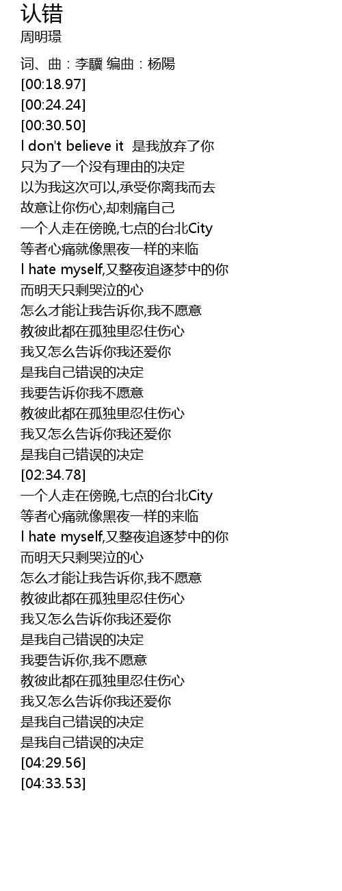 | [00:33.25] | l don't believe it 是我放弃了你 |