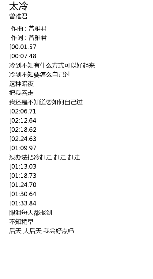 | [03:30.69][02:18.62][01:00.60] | 冷到我整个人快结冰 |