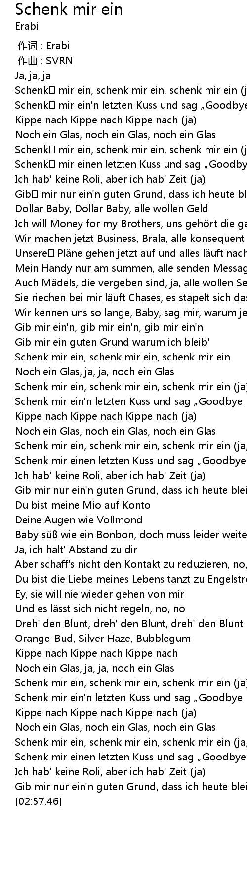 | [02:44.27] | Schenk mir ein, schenk mir ein, schenk mir ein (ja, ja, ja) |