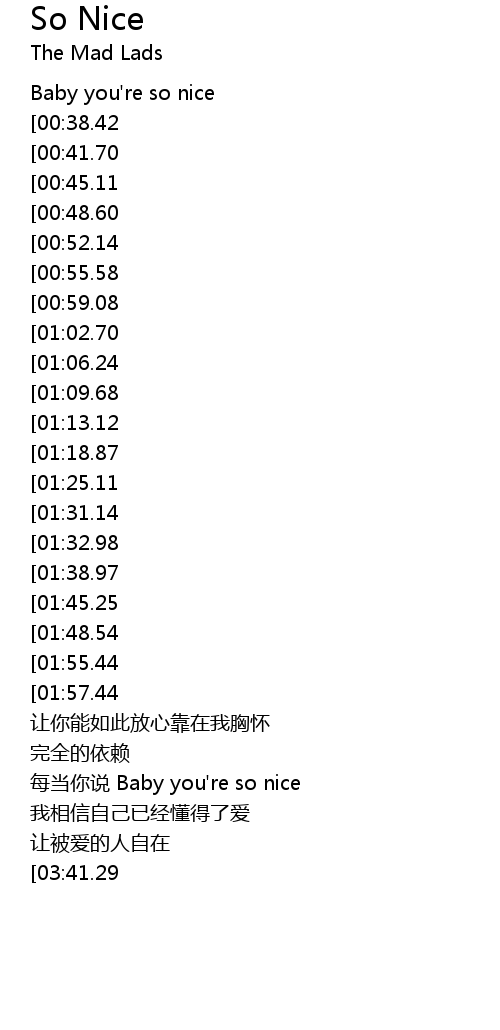 | [04:30.75][03:41.29][02:11.37] | Baby you' re so nice |