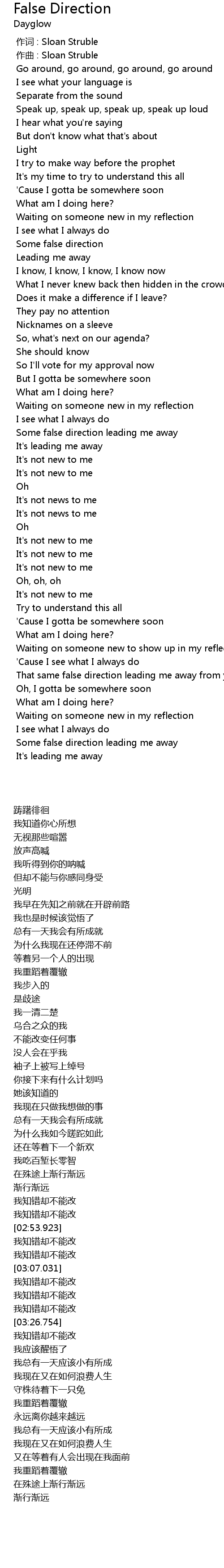 | [02:29.764] | Some false direction leading me away |