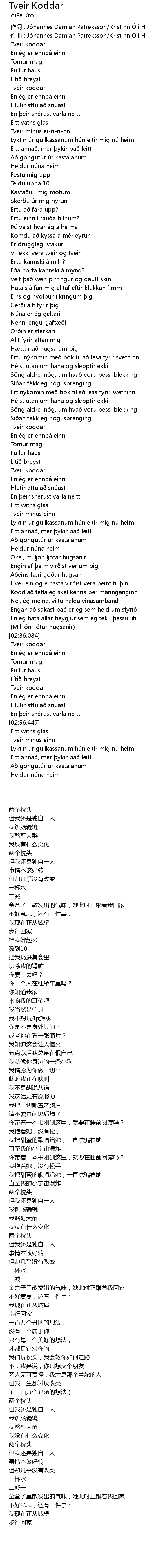 | [00:00.000] | zuo ci : Jo hannes Damian Patreksson Kristinn Ó li Haraldsson |