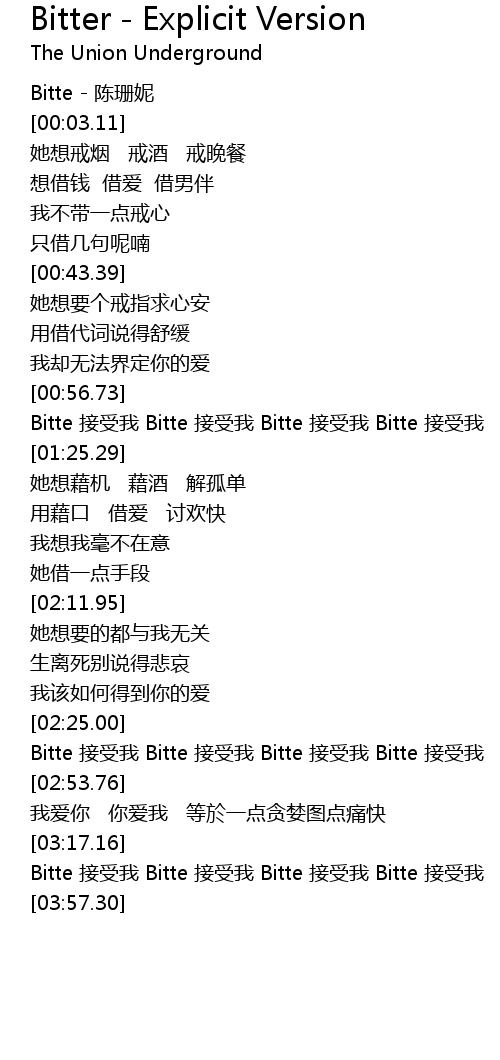 | [03:28.52] | Bitte jiē shòu wǒ Bitte jiē shòu wǒ Bitte jiē shòu wǒ Bitte jiē shòu wǒ |