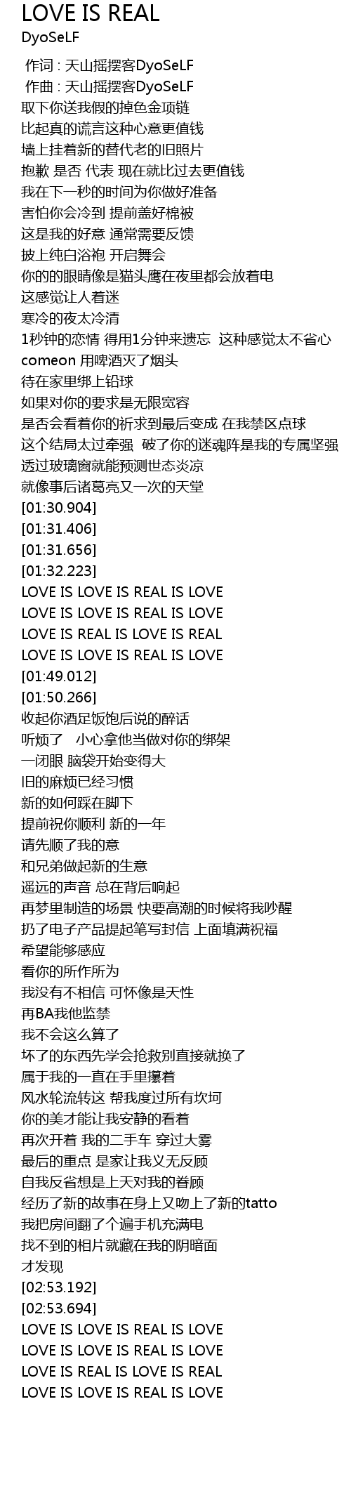 | [01:32.974] | LOVE IS LOVE IS REAL IS LOVE |