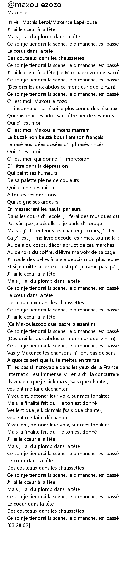 | [00:34.78] | J' ai le c ur à la f te ce Maxoulezozo quel sacré plaisantin |