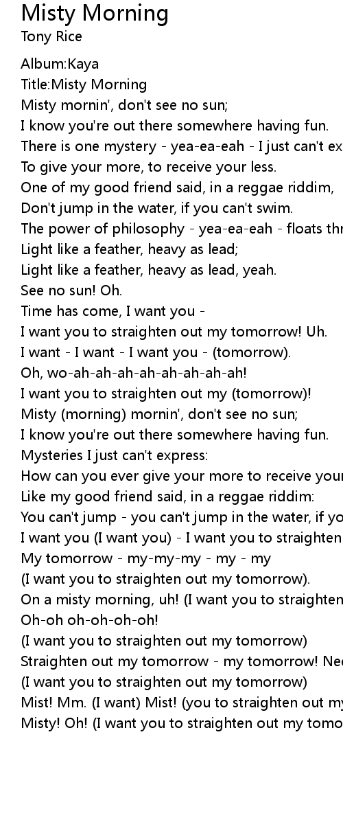 [02:04.89] Misty (morning) mornin', don't see no sun;