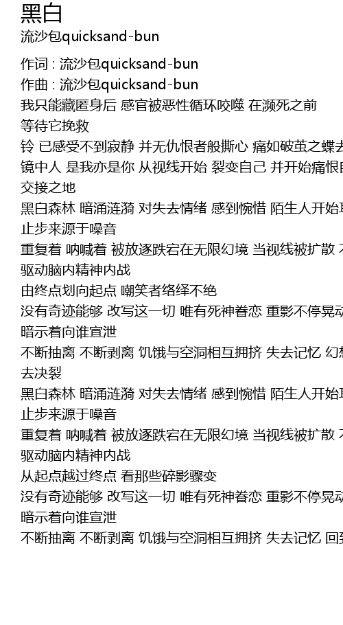 | 没有奇迹能够 改写这一切 唯有死神眷恋 重影不停晃动摇曳 暗示着向谁宣泄 | |