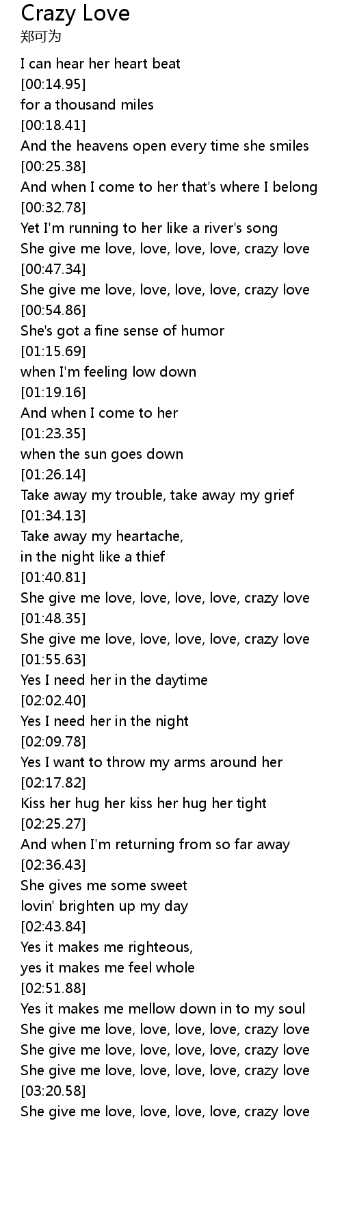 She give me love, love, love, love, crazy love |