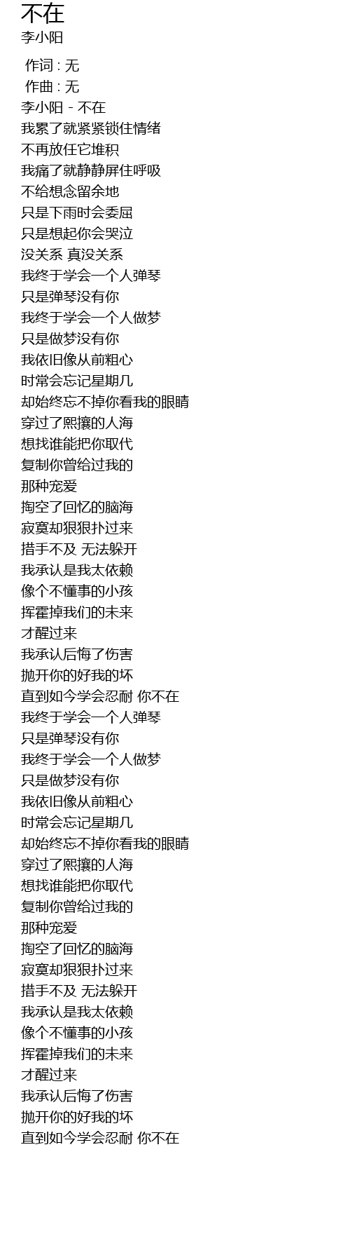 | [00:00.17] | 李小阳 - 不在 |