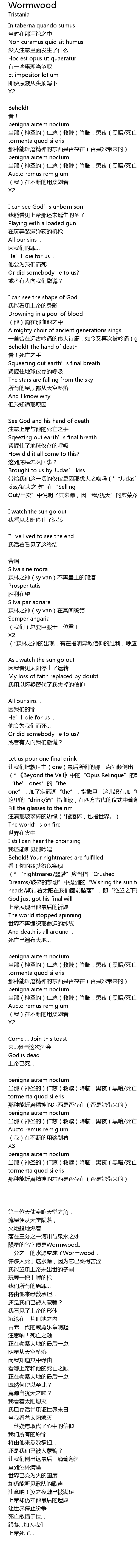 | (* 《Beyond the Veil》中的“Opus Relinque”的歌词“ Let us be ‘the’ ones”的“the one”,加了定冠词“the”,指撒旦。这儿没有加“the”指救世主/弥赛亚。这是我有一次无意搜索东西时看见的,无法将原网页贴出来,这是其阴谋论的研究之一。 | |