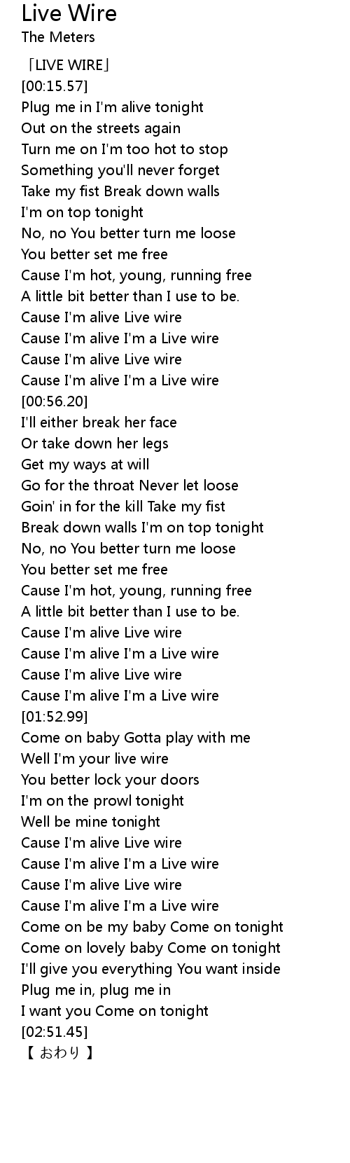 | [00:43.02] | Cause I' m alive I' m a Live wire |