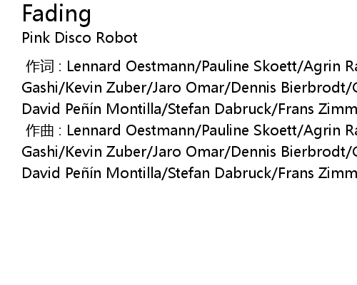 | [00:00.00-1] | zuo qu : Lennard Oestmann Pauline Skoett Agrin Rahmani Azer Ilira Gashi Kevin Zuber Jaro Omar Dennis Bierbrodt Guido Kramer Juergen Dohr Jose David Pei n Montilla Stefan Dabruck Frans Zimmer Rui z Marengo Daniel Deimann |